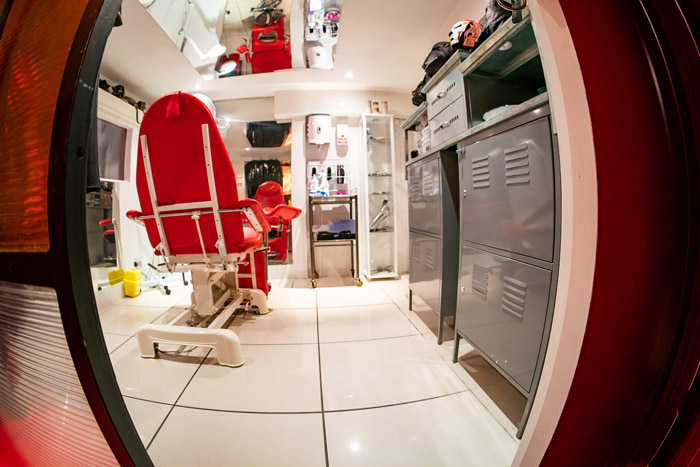 Take playing doctors and nurses to a whole new level, with our unique, state-of-the-art medical room. This hi-tech room has been especially designed to bring your medical fantasies to life, with its sterile, gleaming tiles, rows of antique metal cabinets and centrepiece of a foreboding, fully adjustable, authentic, treatment chair.